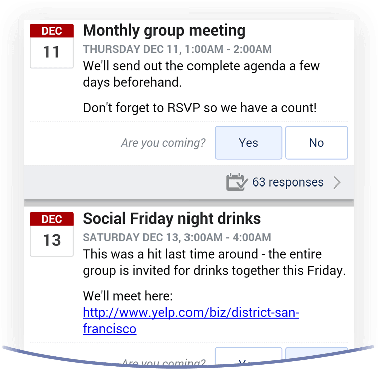 Members get automatic push reminders to RSVP and attend. The result: More people show up.